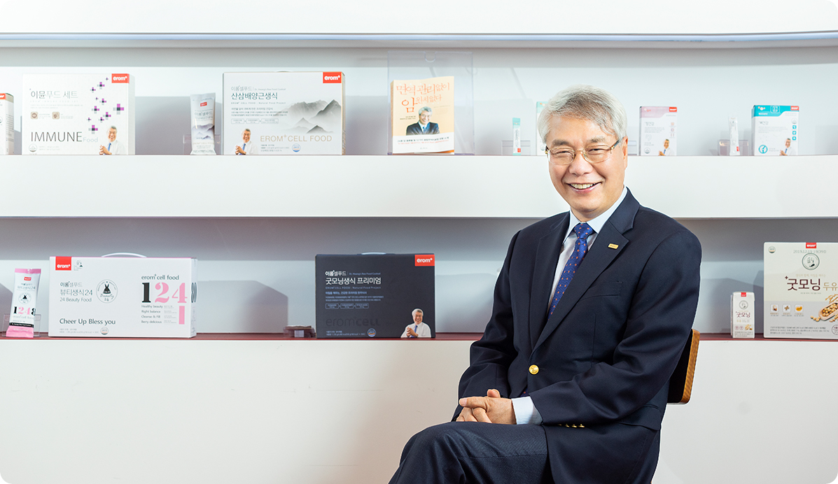 如果当初我忽视了“该吃什么才能不得癌症?”这一思考,就不会有今天的一切。那时我担任 P 公司的科学顾问,尝试过该公司及美国知名企业的产品,但以医生的专业判断来看,那些饮食疗法与现实脱节严重。正当我思考 “这不是正确方向” 时,偶然接触到了生食。此后,我便致力于将我们传承五千年的传统“生食”加以科学化并推广普及。第一年销售额达 1 亿(韩元),第二年 18 亿(韩元),第三年更是飙升至 100 亿(韩元)。此后,公司销售额持续突破百亿(韩元),实现了跨越式成长。如今,erom 生食已已牢牢奠定了其“国民食品”的地位,更成为了全球人的健康食品,远销美国、中国、加拿大、澳大利亚、意大利、马来西亚、印度尼西亚、巴西、南非等 20 个国家,还入驻了美国最大的有机食品连锁超市 “全食超市(Whole Foods Market)” 及健康食品连锁店 “维生素商店(Vitamin Shoppe)”。 这一切之所以成为可能,是因为我能共情癌症患者的痛苦与煎熬。“关爱他人之心、怜悯之心、珍惜之心”,正是最强大的动力源泉。因此, erom 肩负着 “造福人类,造福世界”“邻里关爱科学” 的使命,倍感荣幸。 以“邻里关爱科学”为基础的生食,是蕴含自然生命力的健康食品。我与 erom 生命科学研究院的团队从未停止研究,致力于从 “种子胚芽、酵素、膳食纤维、植物化学物质、维生素” 等天然原料中提取最优营养,最终打造出配方绝佳、品质卓越的 “ erom 生食”。