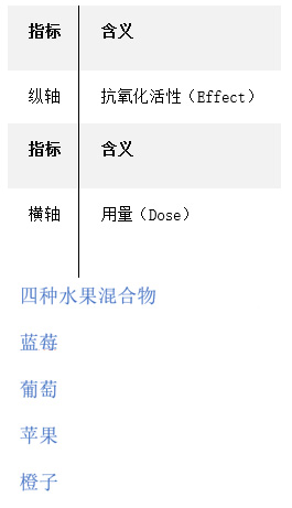 - 针对橙子、苹果、葡萄、蓝莓及其混合物,按不同剂量测量抗氧化活性。